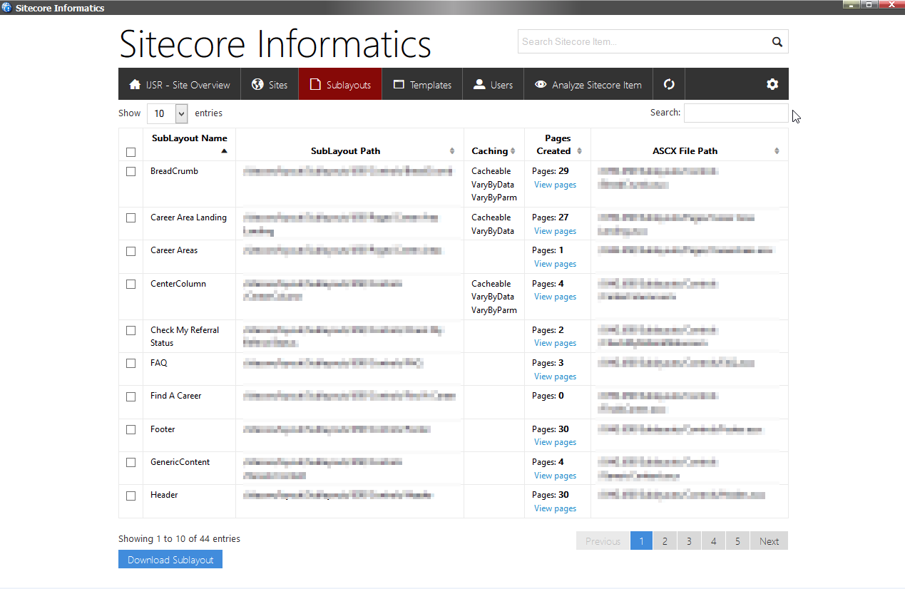 - Total number of Sublayouts in your Sitecore instance along with referrer pages and caching parameters